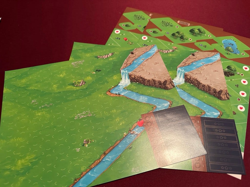 I had not heard anything about Cozy Stickerville before this. I will admit, I had a bit of anxiety looking at those blank maps, the empty field and the mountain, knowing the game wanted me to put stickers on their permanently. In fact, the VERY first instruction is to stick the 6 “setup” stickers on the map WHERE EVER YOU WANT?? WHAT?! (I mean, still following the basic placement rules but otherwise ANYWHERE! In this economy?!).