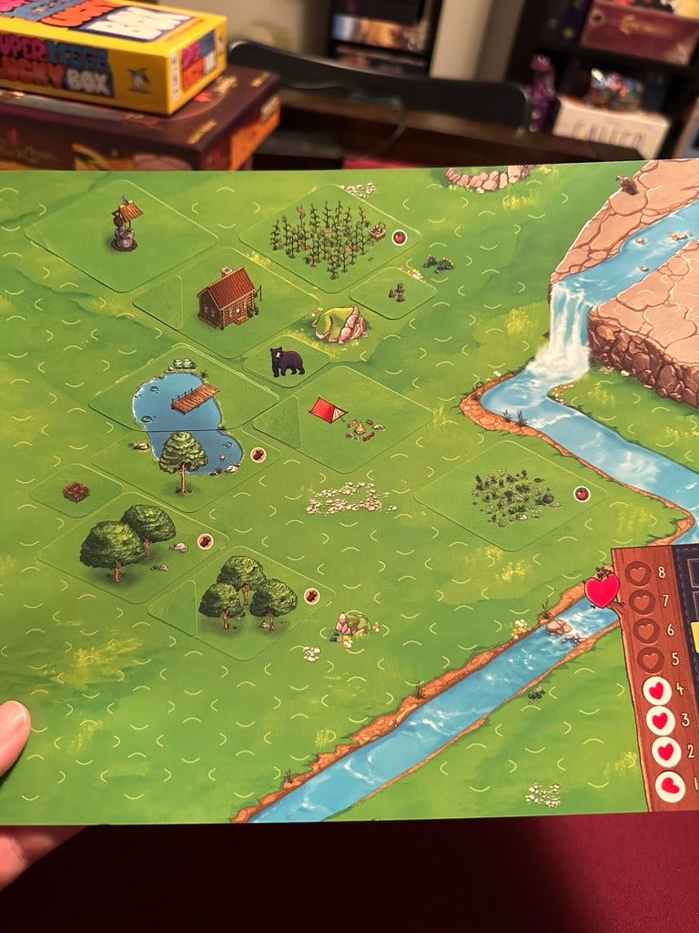 You’re escaping from your day to day life as a banker in the big city and set up a tent in the middle of the woods. You flip over cards that provide little choose your own adventure moments. Those decisions lead to stickers and unlocking other cards and story moments. You decide what resources to gather at the end of your turn, then move on to the next day, until you go through the tiny deck of 12 events. At the end, you’re judged by your happiness rating and milestones you achieved.