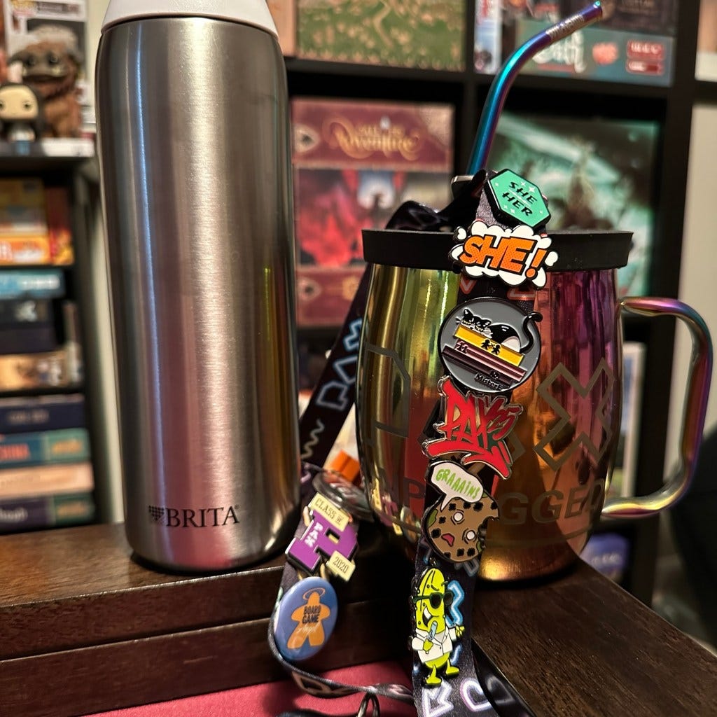 The first thing I grab is my PAX Unplugged Wild Bill’s Soda mug. Wild Bill’s Soda is a convention staple. Their sodas have unique flavors and it’s always fun to sample them. If you buy one of their fancy mugs at a convention, then going forward you just pay for the day or weekend pass for unlimited refills. Do I do this? Yes. Do I drink enough soda to justify the price of these things...probably not! But being able to fill up my mug with a little sugary pick-me-up near the end of the day is a treat I look forward to.